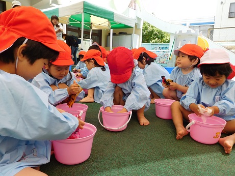 自分のハンカチを一人一つのバケツに入れ、ハンドソープをちょっぴり入れて洗濯の始まりです。
