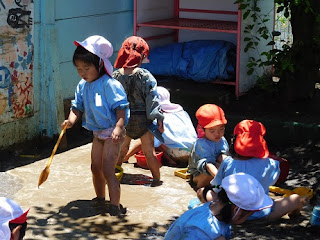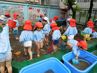 最初に終えたクラスの子は、もっとやりたかったのかな?砂場の外でじっと見つめていました。