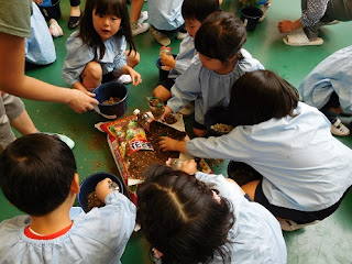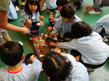 鉢に鉢底石を入れ、土を入れたら苗を置きます。ポットから出すのに苦労している子もいましたが、先生から教えてもらったやり方で頑張る姿が見られました。