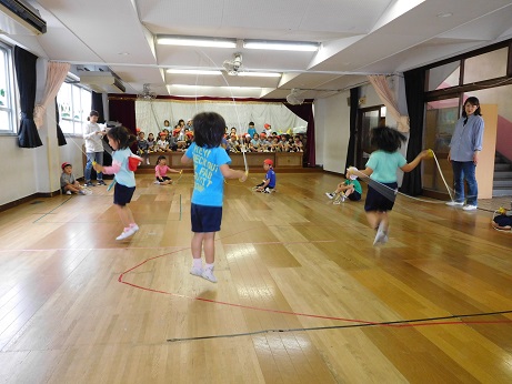 年中組の時の運動会の時に一人ずつにもらったなわとびですが、それ以来練習している子、あまり練習していない子と様々いたようです。