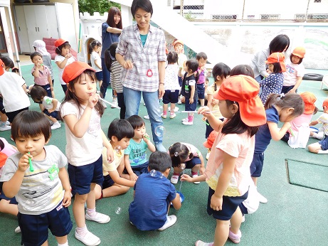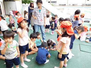 吹き方を教えてあげ、一緒にしゃぼんだまを膨らませ、年長組も楽しそうでした。