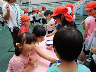 昨日年長組が自分たちでしゃぼん玉の液を作って遊んでいました。