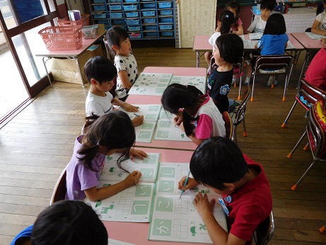 高木幼稚園の「文字あそび」では、まず先生の話をしっかり聞くこと・おしゃべりなどしないこと・正しい姿勢を心がけること・鉛筆の持ち方を知ること・字を知り興味を持つこと をねらいとしています。