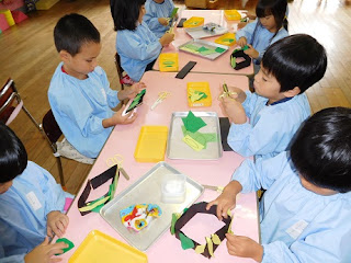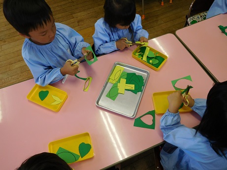 踊りたくなった年中組は自分の葉っぱの冠をつくることにしました。