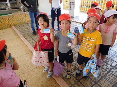 今日たんぽぽぐみは、首からカードをさげ、お使い袋を持っておでかけです。