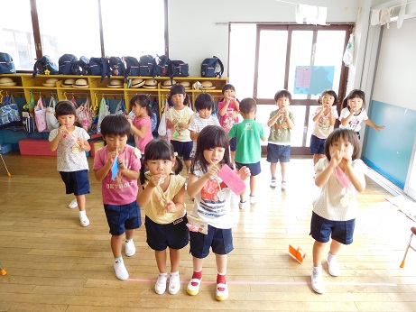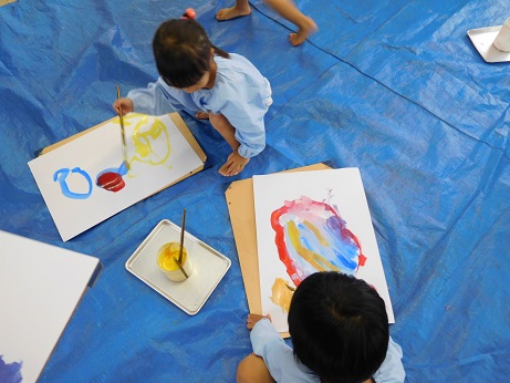 絵の具という素材の面白さを味わえたかな?まずは絵の具の楽しさを十分に味わうことが、絵を絵の具で描くことにつながります。 片付けなどもありますが、保護者の方にお手伝いいただき、回数を重ねて経験することが出来ています。