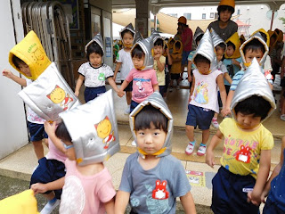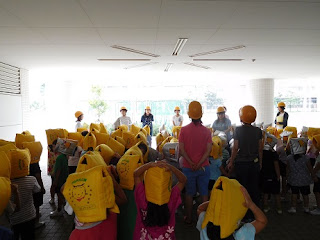 これまでも何回か避難訓練をした子ども達ですが、まだ防災頭巾をかぶるのに手間取る子、せっかく被ったけれど縦と横が反対になっていて、頭頂が薄い部分になっている子がいました。いざという時にきちんと被れ、防災頭巾としての役割が果たせるよう、ご自宅でかぶり方を再度確認してみてください。