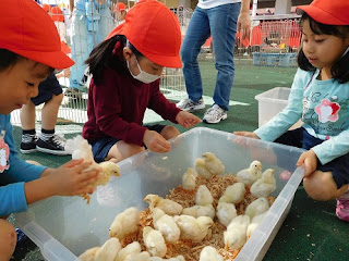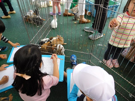 在園児は、午前中に触れ合ったので、柵などの外側から見るという形にしました。年長組の中には可愛かった動物の絵を描く子もいました。