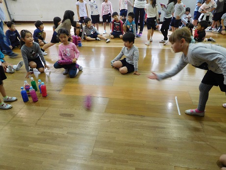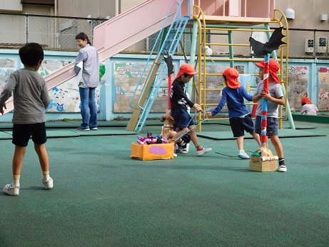 みんなで4つのゲームを考えました。これは、ハロウィンの時の車に乗っているお菓子などを落とさないようにしながらリレーをするというもの。