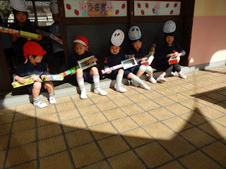 年少組は空き箱でギターを作っていました。嬉しそうに持って歩き、時々演奏をしてくれました。