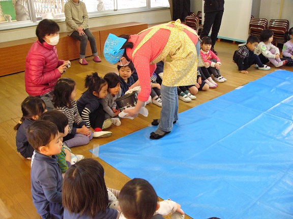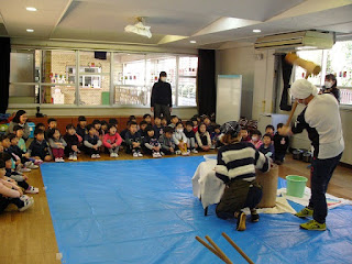 年少・年中組は、佐々木先生やお手伝いのお父さん先生たちがつく様子を見ました。