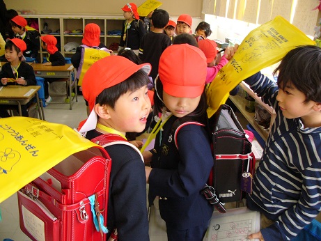 1年生の部屋に案内してもらい、ランドセルを背負わせてもらっています。