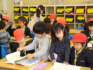 今日は、年長組は菊名小学校へ行きました。まずは体育館で集まり、挨拶。