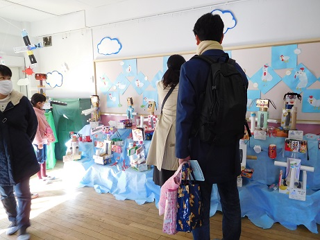 本日は、造形展です。これまで子ども達が楽しみながら作ってきた作品を見ていただく日です。