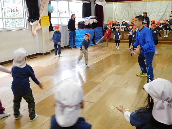 年中組は「ばくだんドッジボール」で、少し簡単なドッジボールですが、ルールを教えてもらい、ボールを投げたりよけたりキャッチしたりしてきました。