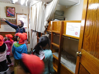 日本丸は、かつて実際に乗組員として働いていた方がボランティアガイドをされていて、話を聞いた子もいました。
