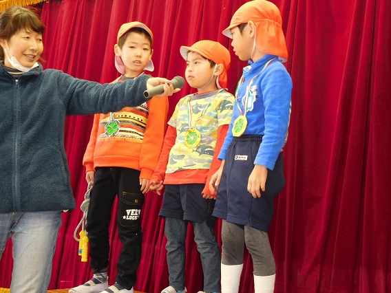 今日は、最後の縄跳び大会で、メダルは取れなかったけれどこれまで一生懸命練習してきたみんなに先生からメダルをプレゼントしました。