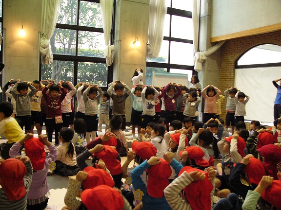 今日は、幼稚園のみんなで集まり「よろしく集会」を行いました。