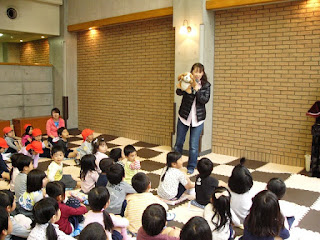 全員集まるのは初めてです。先生とわんきちくんの話を聞いたり、年長組さんから手遊びを教えてもらったりしました。