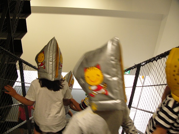 年少組はみんなで防災頭巾をかぶる練習をしましたが、まだうまくかぶれない子、後頭部が頭頂にきてしまう子もいました。(年中組でも何人かいました)