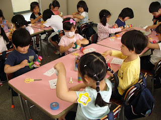 みんな真剣です。テーブルの上にある色々な色のビニールテープも譲り合いながら使う姿は、年中組さんだなと感じました。