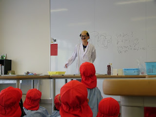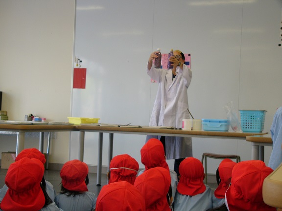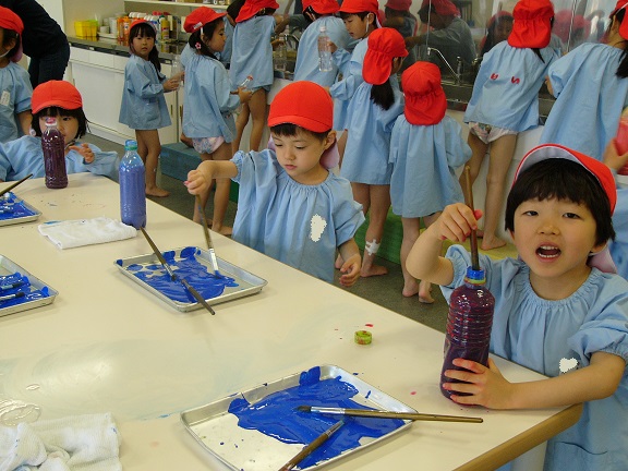 近くに絵の具が置いてあったから誰かが実験したのかな?ということで、博士が絵の具で色水を作れるか実験してみました。色水が出来ましたが、見ていたみんなもやりたいということになり、
