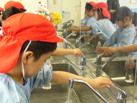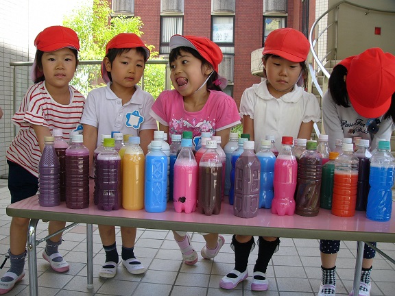 一度作った色水は、そのままにしておいても良いし、最初からもう一度やりたい子は流しに流して色水を作ります。