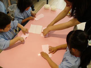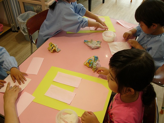「四角い折り紙の角と角を合わせて折る」という簡単なものですが、初めての子にとっては難しいことです。先生のやり方を見て、両手をそれぞれ別に動かし折っていくという様々な動きが入っています。長四角を二つ作り、中をのりで留めて、