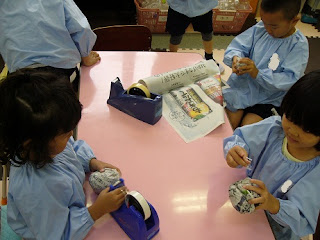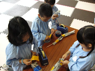 今日も、なつまつりのお店の品物を作っていました。おみせは6つあるのですが、少しずつ準備しています。今日のゆきぐみは、「ヨーヨー」です。明日年中組さんとも一緒に作りますが、その下準備です。昨年も年長組さんと一緒に作ったことを覚えている子もいましたが、下準備をしてくれていたことはよくわからなかった子もいたようです。