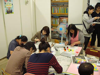 まずは七夕のお話を子ども達に見せてあげるという事で、皆さんで準備です。中には卒園児のお母さんも参加されていました。