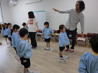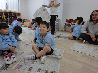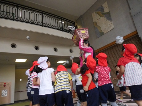 年中組は、2カ所に分かれて活動することも行っています。こちらのグループは新聞紙を丸めて玉入れの様にして楽しんでいました。