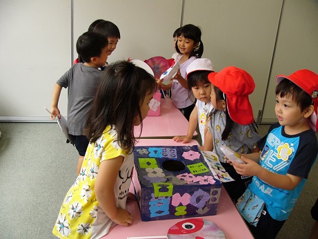 ゆきぐみは「のみものやさん」「ヨーヨーつり」「一円玉おとし」の3つ。ほしぐみは「チョコバナナ」「おみくじ」「かきごおり」の3つでした。これまでの経験を活かし、必要な物を考えたり作り方を相談したり・・・。自分たちで頑張ろうとする姿は、毎年見ていても「さすが年長組だな」と思ってしまいます。