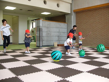 すいかのビーチボールに棒でタッチ出来たらOKです。