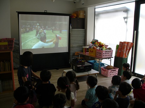 数年前のものだったので、まだ今の年少組は1歳くらいのものですが、「僕はどこにうつっている?」「私は?」「僕のママがいる(お兄ちゃんが在園していて、映像にうつっていました)!」などなど。