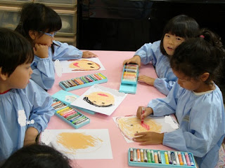 年長組は、自分の絵の具で肌色や髪の色を作り、描いていきます。