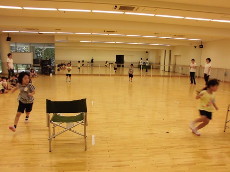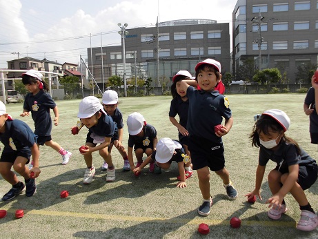 玉入れ。籠をよく見て、拾った球を投げ、すぐにまた球を拾い・・・
