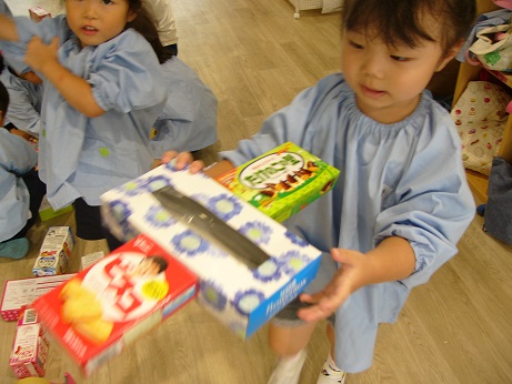 年少組は、各ご家庭から持って来ていただいた空き箱を使って、制作に挑戦です。