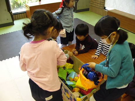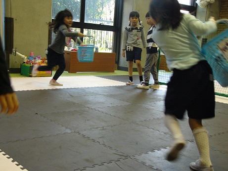 ↑こちらは、きのこの山からきのこを1つ取って次の人に籠をわたし、どちらのグループが早くすべてのきのこを籠に入れることが出来るかの競争。