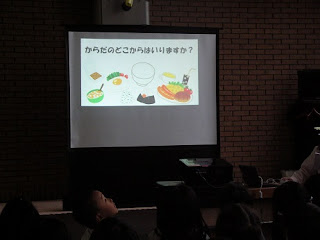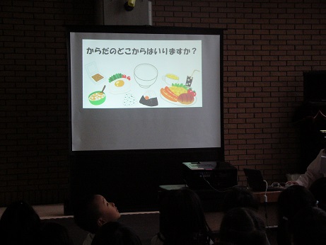 金曜日は、年長組さんの「食育講座」でした。いつも給食を届けてくれる「わくわく広場」さんが、年長組を対象に年に数回食育講座を行ってくださっています。
