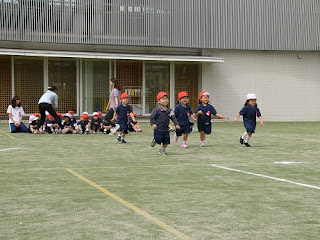 年少組のかけっこ。一生懸命ゴールを目指して走りますが、曲がってしまう子もいました。当日はゴールで保護者の方が待っていてくださるので大丈夫かとは思いますが。