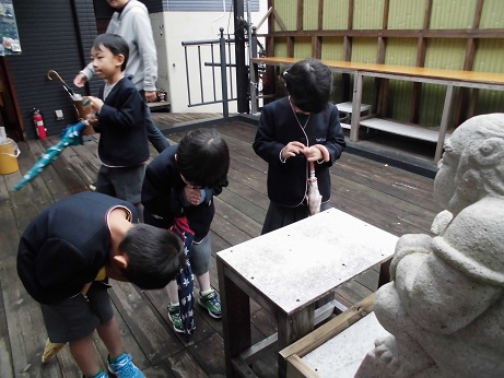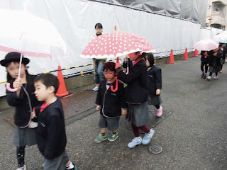 朝から天気が心配でしたが、年長・年中組は傘をさし、年少組は年長組の傘に入れてもらい、歩いて菊名神社に向かいました。