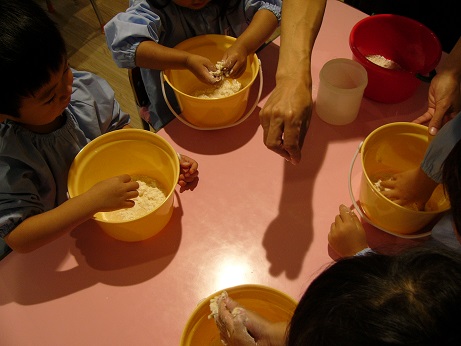 先生が触ってみているのを見て、「欲しい」「作りたい」となり、みんなも「小麦粉粘土作り」に挑戦です。