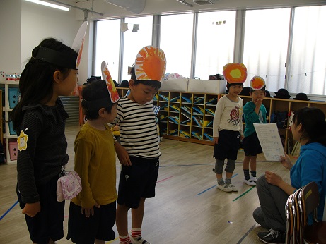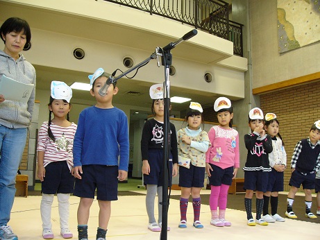 自分の役が決まり、お面を作り、劇に参加しています。年中は友達と一緒に、年長は自分だけでマイクのところでセリフを言ったりします。