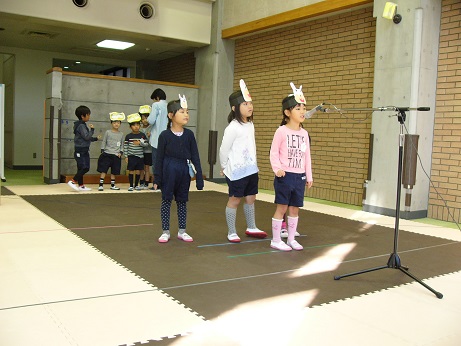 まだセリフを覚えていない子もいますが、先生に教えてもらい、自分のセリフをマイクで話していました。他の子のセリフを聞き、タイミングよくセリフを言うことも大切ですね。