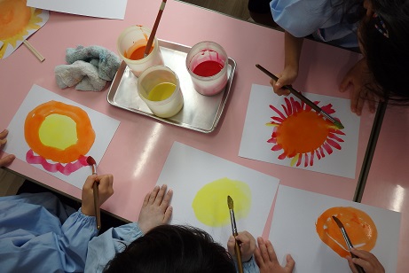 そして、お話を聞き終わると、そのお話のエンディングの歌に合わせて踊ったり、登場人物になるためのお面を作ったりしました。