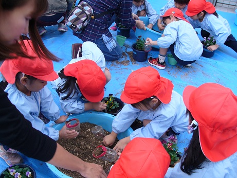 下から水が出てくる位水を入れました。水を入れるときは、「花や葉に水がかからないようにする」と教えてもらい、そっと花や葉を手で押さえて水をあげていました。