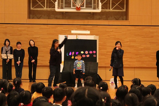 体育館に全員集まり、先生たちからの歌のプレゼントを聞いた後、お母さんたちによる、パネルシアターです。