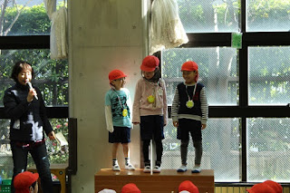 なわとび大会では、前跳びで1度縄を回すときに2回ジャンプをするという跳び方で跳んでいます。グループに分かれ、一斉に跳び始めて、ひっかからずに最後まで跳べた上位3名を表彰しています。