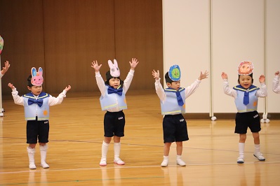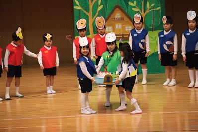 年長組。これまでの様々な経験(友達と力を合わせる・一緒に絵本の世界を楽しむ・自分の役割を果たす等々)の集大成です。劇の内容も話し合い、先生と子どもみんなで作り上げました。お客様に楽しんでいただくためにどうしたら良いか、考え工夫していました。
