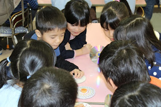 年長組は今日は(生活発表会予行練習前日ですが)、こまづくりに挑戦。